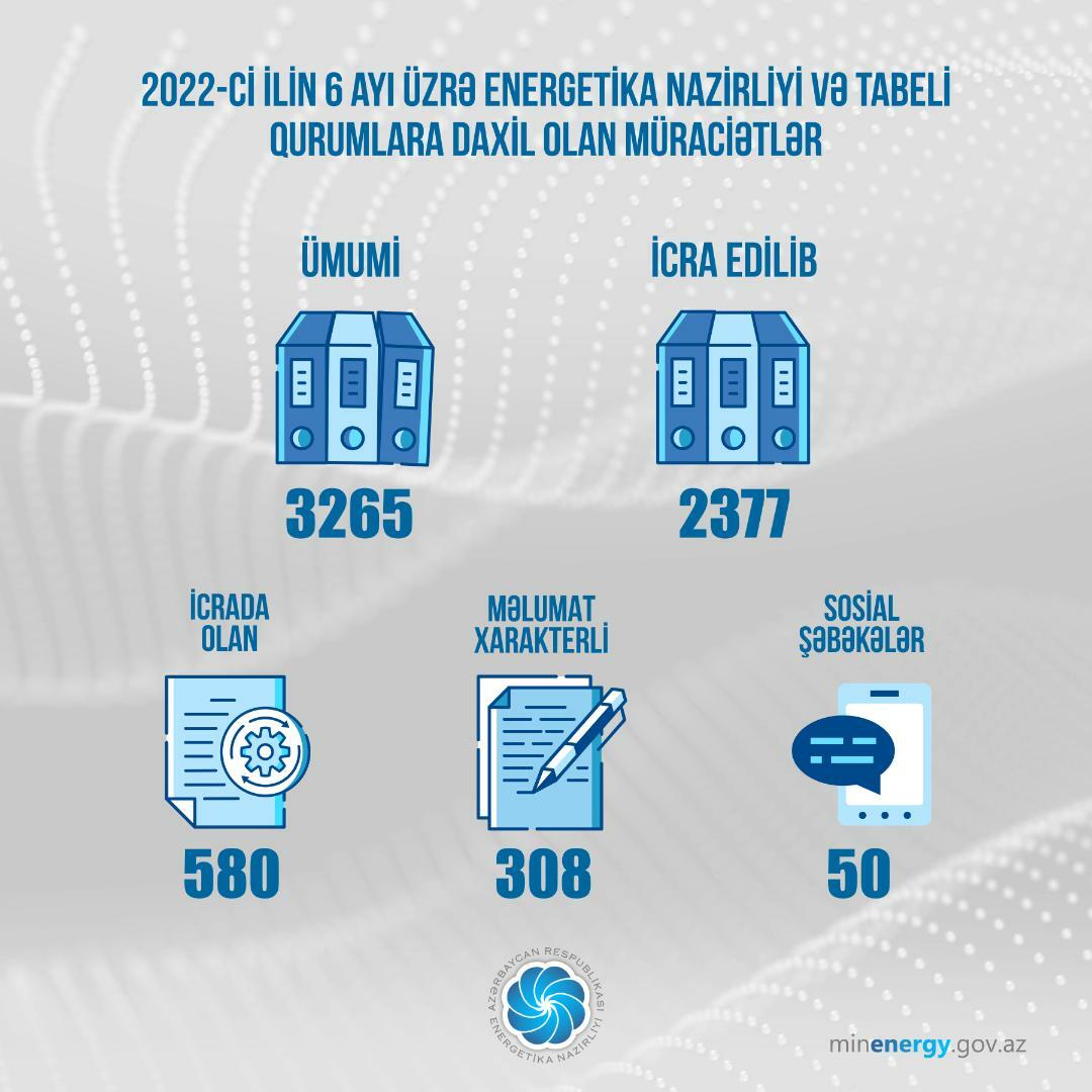 15 İyul 2022 13:04 Energetika2022-ci ilin 1-ci yarısında Energetika Nazirliyi və tabeli qurumlara 3265 vətəndaş müraciəti daxil olub ki, bunlardan 2377-si müvafiq qaydada icra olunub, 580-i isə icradadır. 308 müraciət məlumat xarakterlidir.