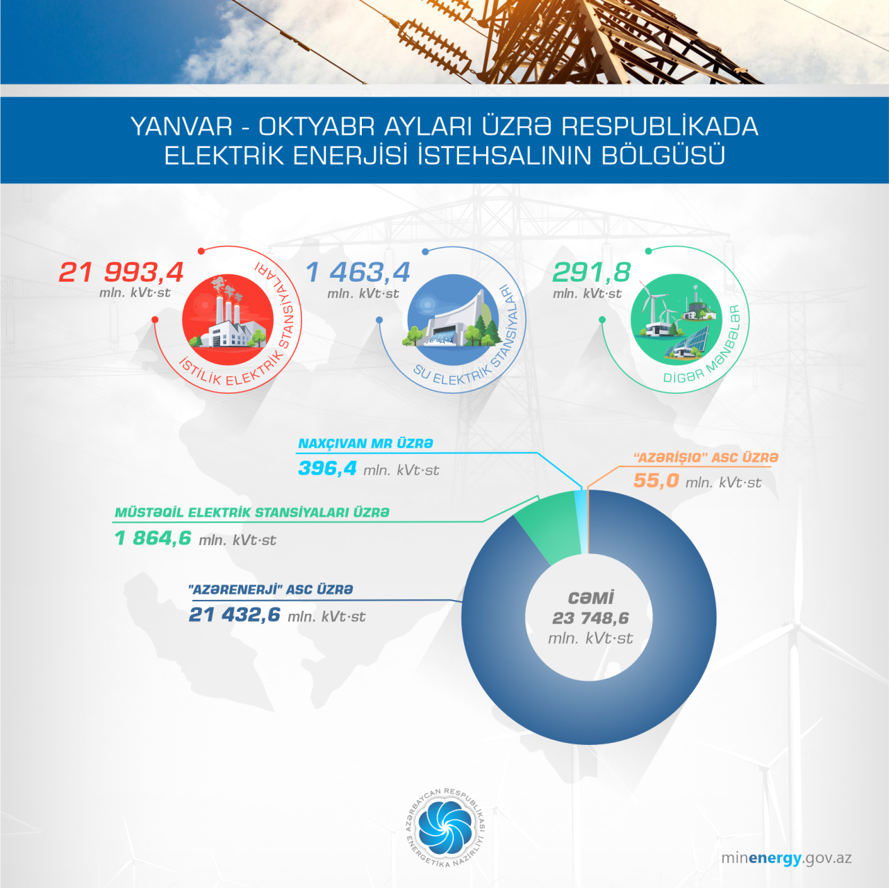Yanvar-oktyabr aylarında külək elektrik stansiyalarında 73,4 mln. kVt·st, günəş elektrik stansiyalarında 55,0 mln. kVt·st, Bərk Məişət Tullantılarının Yandırılması Zavodunda (BMTYZ) isə 163,4 mln. kVt·st elektrik enerjisi istehsal edilib.