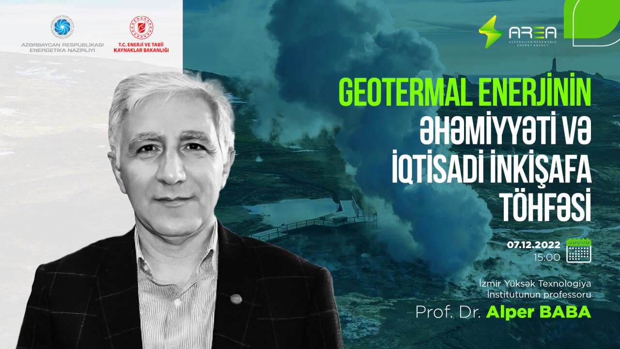 "OLAYLAR"-a Energetika Nazirliyi yanında Bərpa Olunan Enerji Mənbələri Dövlət Agentliyindən verilən məlumata görə, vebinarda İzmir Yüksək Texnologiya İnstitutunun professoru, Dr. Alper Baba tərəfindən dünyada bərpa olunan enerji istehsalında geotermal enerjinin rolu, iqtisadi inkişafa təsiri, texnoloji irəliləyişlər və digər məsələlər barədə ətraflı məlumat veriləcək, iştirakçıların mövzu ilə bağlı sualları cavablandırılacaq.
