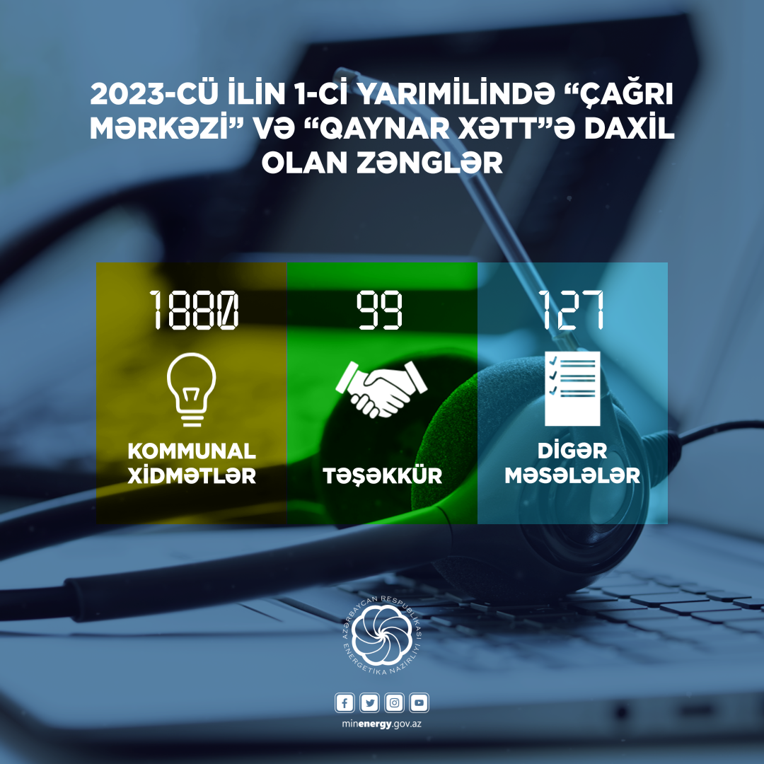 Qeyd edək ki, vətəndaşların müraciətlərinə baxılması işinin səmərəli təşkili məqsədilə Energetika Nazirliyinin "974" "Çağrı Mərkəzi" və (012) 598-16-55 "Qaynar Xətt"i fəaliyyət göstərir. "Çağrı Mərkəzi"nin xidmətlərindən istifadə etmək üçün vətəndaşlar Bakı şəhəri üzrə "974", bölgələrdən və ölkəmizdə mövcud olan bütün mobil operatorlardan "012 974" nömrəsini yığmaqla zəng edə bilərlər. Çağrı Mərkəzi qanunvericilikdə nəzərdə tutulmuş qaydada iş günlərində saat 9.00-dan 18.00-dək fəaliyyət göstərir.