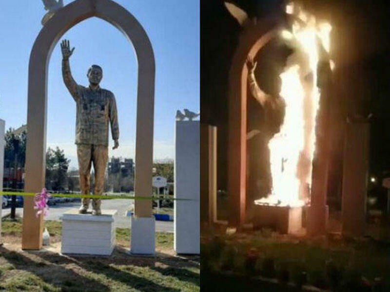 İranın Qeşm şəhərində etirazçılar Qasım Süleymaninin heykəlinə od vurublar.