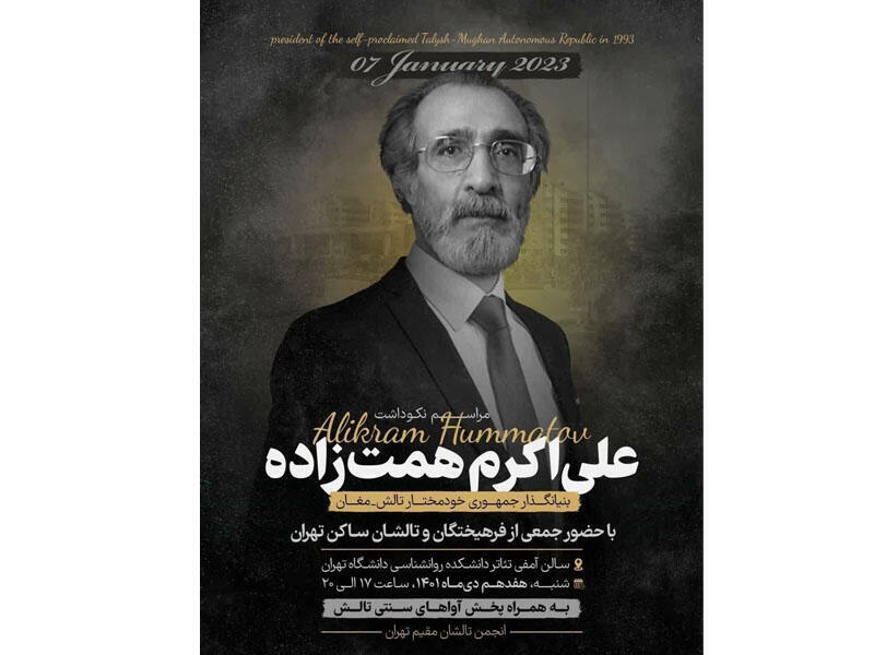 Vərəqələrdə "talış-muğan muxtar cumhuriyəti"nin banisi kimi təqdim olunan Ələkrəm Hümbətovun anım mərasiminin yanvarın 7-də Tehranın Psixologiya İnstitutunun akt zalında keçiriləcəyi bildirilib.