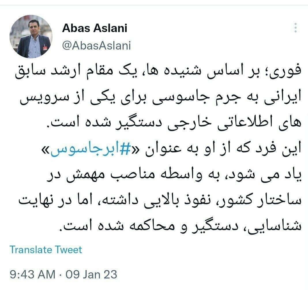 Olaylar.az xəbər verir ki, İranlı media fəalı Abbas Aslani öz Twitter hesabında yazıb: "TƏCİLİ: Məlumatlara görə, İranın keçmiş yüksək vəzifəli bir məmuru xarici kəşfiyyat xidmətinə casusluq etdiyi üçün həbs olunub. "Super casus" adlandırılan bu şəxs mühüm vəzifə daşıdığına görə ölkənin strukturunda yüksək nüfuza malik olsa da, nəhayət ki, müəyyən edilərək həbs və mühakimə olunub".