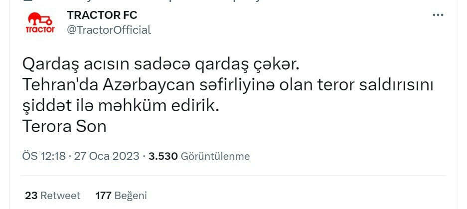 27 Yanvar 2023 13:33 GüneyAzərbaycanın İrandakı səfirliyinə silahlı hücum İran daxilində də ciddi etirazla qarşılanıb. Milli.Az xəbər verir ki, İrandakı "Traktor" futbol klubu terror hücumu ilə bağlı paylaşım edib.