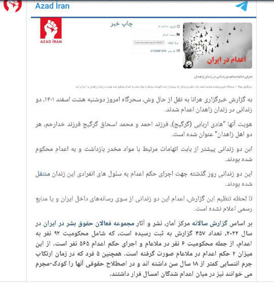 Bildirilib ki, Sistan və Bəlucistan əyalətinin Zahedan şəhər zindanında saxlanılan iki məhkum edam edilib.