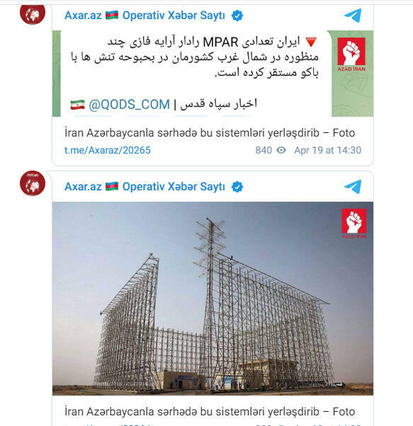 "İran ölkənin şimal-qərbində bir sıra çoxməqsədli mərhələli radarlar yerləşdirib", - Teleqram kanalında qeyd edilib.
