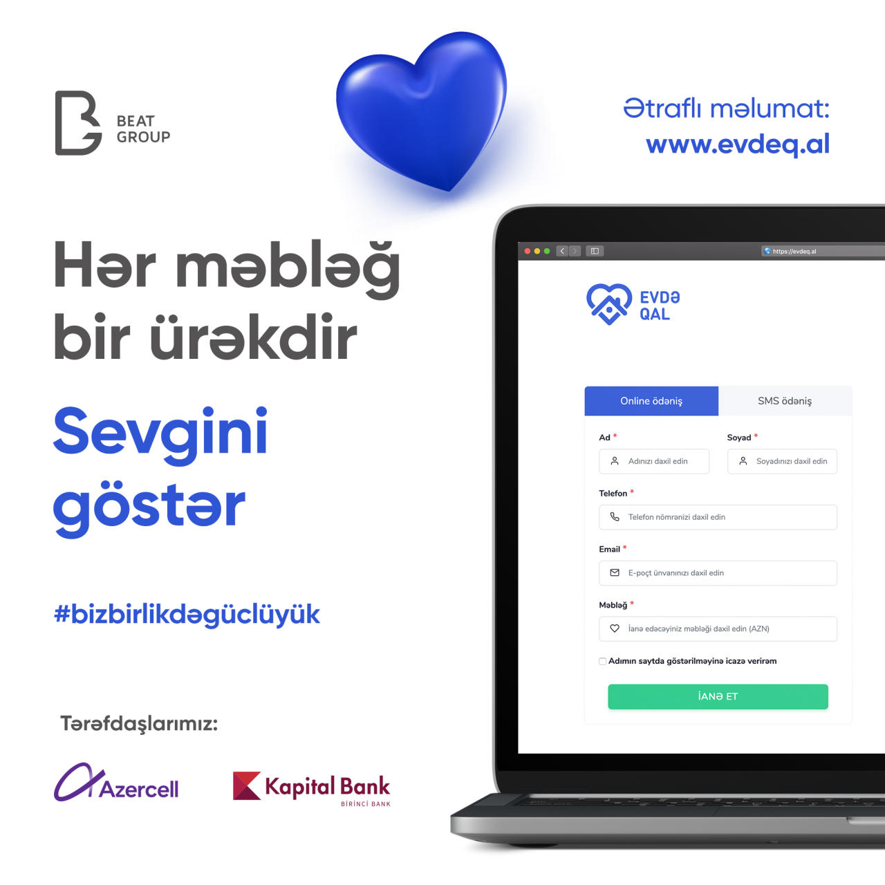 Xeyriyyə təşəbbüsünə qoşulmaq üçün 5595 qısa nömrəsinə ianə edilən məbləği (1, 5 və ya 9) mesaj vasitəsilə yazıb göndərmək lazımdır, yaxud https://evdeq.al/ saytındakı formu doldurmaqla həmin təşəbbüsü dəstəkləmək olar. Saytdakı "Hesabat" bölməsinə keçid edərək, Azercell abunəçisi ianə edənlərin siyahısında nömrəsinin son 3 rəqəmini və ianə edilən məbləği görə bilər, həmçinin burada ianələrin xərclənməsinə nəzarət etmək, foto və video hesabatlarla tanış olmaq da mümkündür.