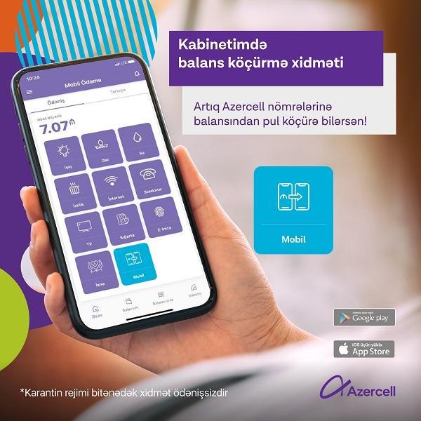 Hazırda koronavirus pandemiyası ilə əlaqədar ölkə ərazisində elan edilmiş xüsusi karantin rejimi dövründə Azercell "Mobil Ödəmə" və "Paycell" xidmətləri vasitəsilə icra edilən balans köçürmələri üçün əlavə xidmət haqqı tətbiq etmir.