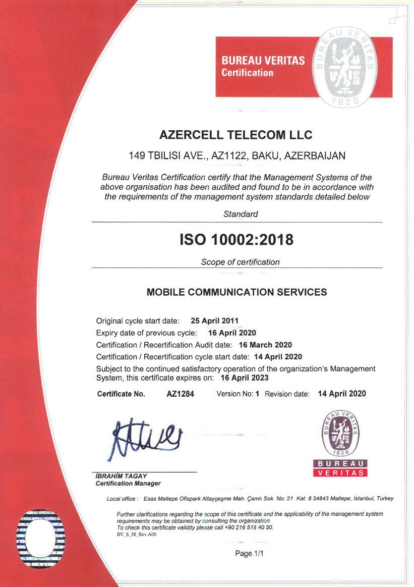 ISO 10002:2018 sertifikatının əldə olunması "Azercell Telekom" MMC tərəfindən müştərilərlə aparılan işin səviyyəsini göstərir. Bu beynəlxalq standart məhsul və xidmətlərlə əlaqəli şikayətlərin qurumlara daxil olması, onların nəzərə alınması, cavablandırılıb həll olunması prosesini qiymətləndirir. Həmçinin, şikayətlərə baxılması işinin daha effektiv şəkildə həyata keçirilməsi üzrə tələbləri müəyyən edir.