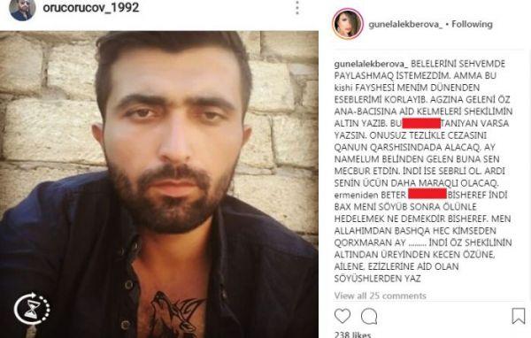"Belələrini səhifəmdə paylaşmaq istəməzdim. Amma bu kişi fahişəsi mənim dünəndən bəri əsəblərimi korlayıb. Öz ana və bacısına aid kəlimələri mənim şəkillərimin altına yazıb. Bu şəxsi tanıyan varsa, yazsın! Onsuz da cəzasını qanun qarşısında alacaq. Atası bəlli olmayan şəxs, buna məni sən məcbur etdin. İndi isə səbirli ol, ardı sənin üçün daha maraqlı olacaq.