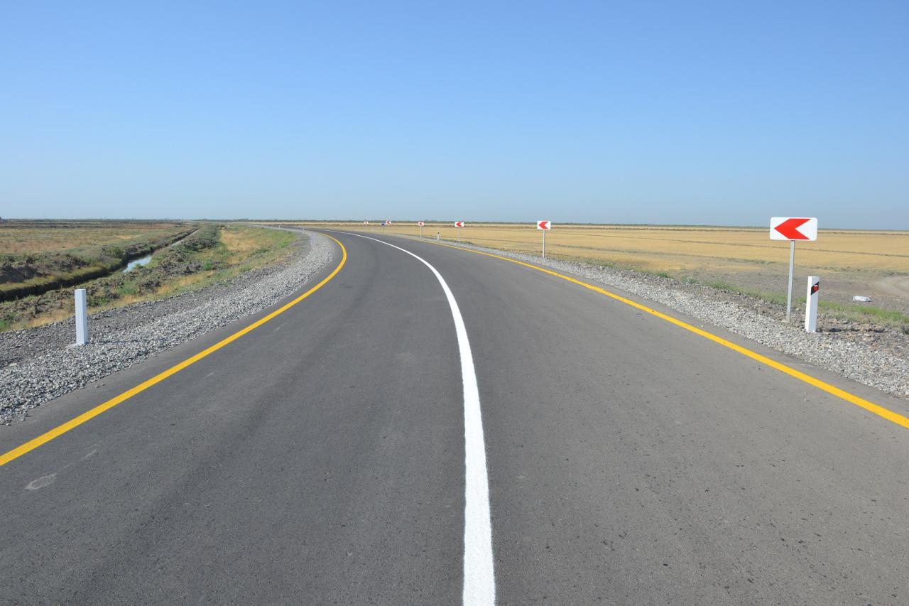 Bunun ardınca isə yol geyiminin tikintisi üçün yol boyu 182 min kv.m sahədə 3 laydan ibarət və 17 sm qalınlıqda asfalt-beton örtüyünün döşənməsi, 125 min kv.m sahəni əhatə edən ərazidə isə çiyinlərin 17 sm hündürlükdə optimal-çınqıl materialı ilə bərkidilməsi işləri görülüb.