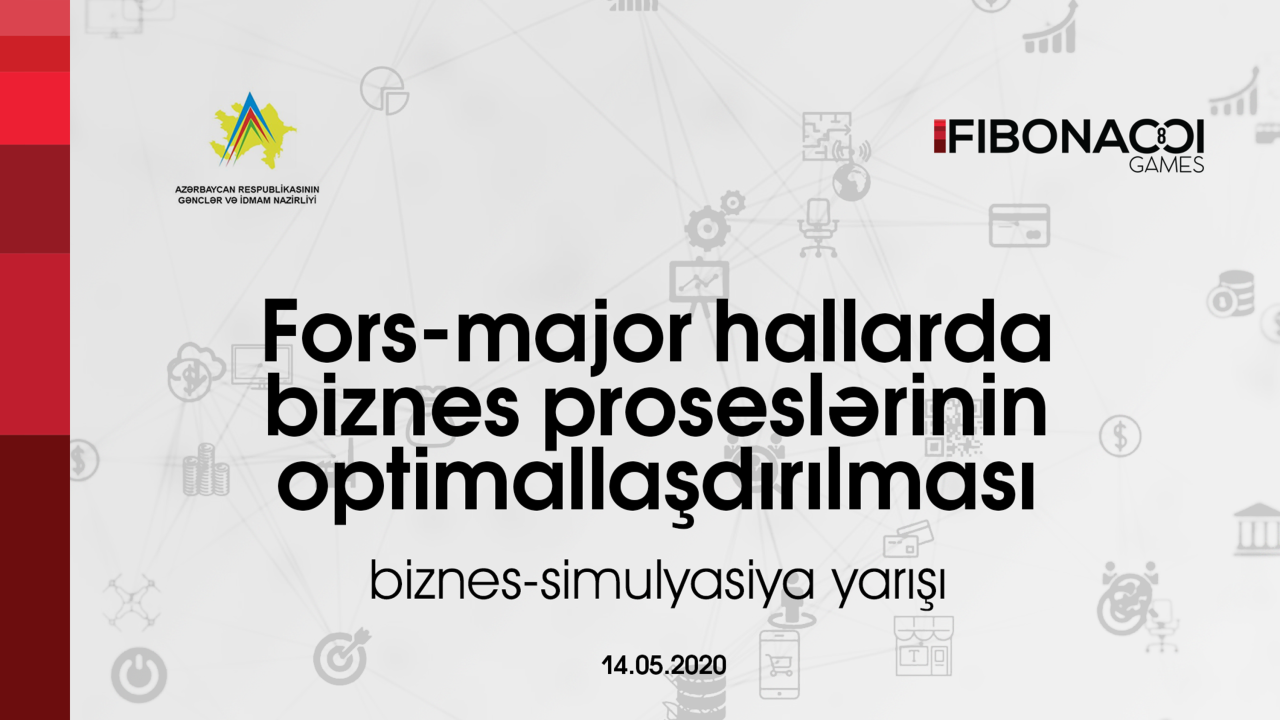15 May 2020 17:16 İqtisadiyyatAzərbaycan Respublikasının Gənclər və İdman Nazirliyinin və "Fibonacci Games"-in birgə təşkilatçılığı ilə gənclər arasında "Fors-major hallarda biznes proseslərinin optimallaşdırılması" adlı biznes-simulyasiya yarışı keçirilib. "OLAYLAR"-a Gənclər və İdman Nazirliyinin mətbuat katibliyindən verilən xəbərə görə, biznes-simulyasiya "praktiki təhsil" konsepsiyası modelidir və qeyri-formal təhsil metoduna əsaslanır. Simulyasiya oyununda bazar iqtisadiyyatına aid real situasiyalar modelləşdirilir və iştirakçılara: müddət, qiymət, risk və qərarların qəbul etmək bacarıqları öyrədilir.