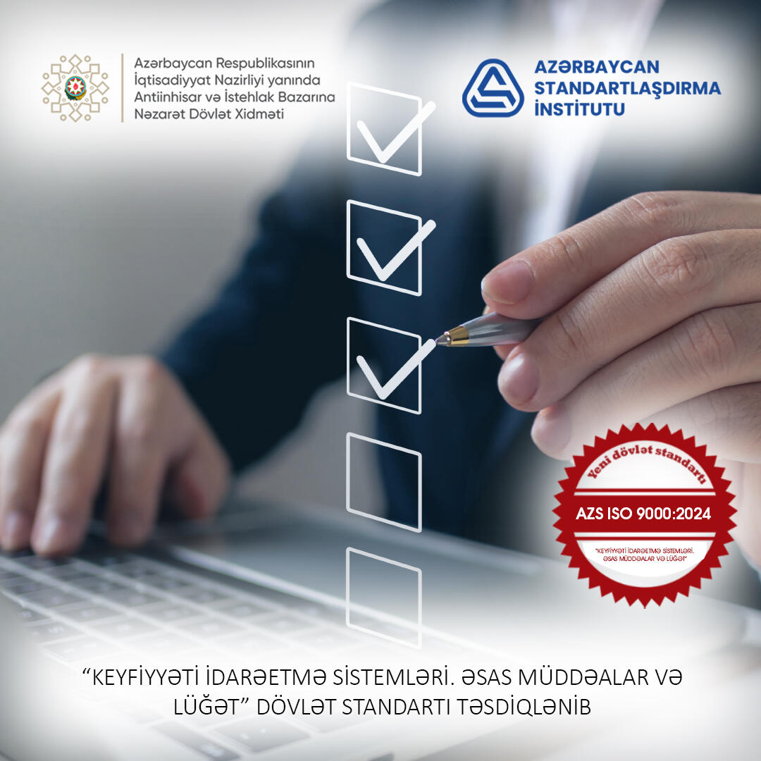 7 Avqust 2024 13:41 İqtisadiyyatAntiinhisar və İstehlak Bazarına Nəzarət Dövlət Xidmətinin tabeliyində olan Azərbaycan Standartlaşdırma İnstitutu (AZSTANDART) tərəfindən ISO 9000:2015 "Quality management systems. Fundamentals and vocabulary" beynəlxalq standartı əsasında AZS ISO 9000:2024 "Keyfiyyəti İdarəetmə Sistemləri. Əsas müddəalar və lüğət" dövlət standartı qəbul edilib.