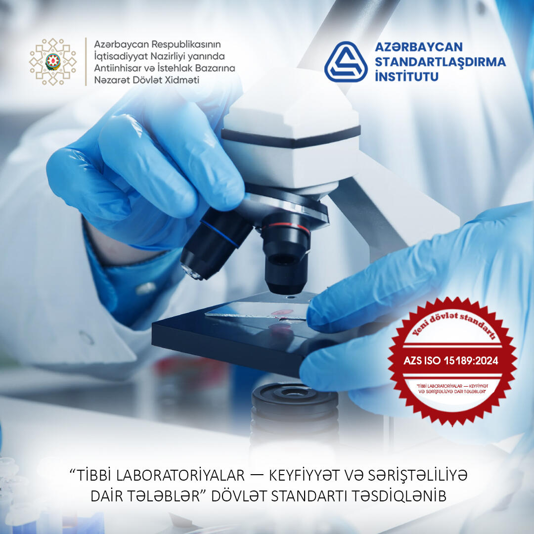 Antiinhisar və İstehlak Bazarına Nəzarət Dövlət Xidmətinin tabeliyində olan Azərbaycan Standartlaşdırma İnstitutu (AZSTANDART) tərəfindən tibbi laboratoriyaların keyfiyyət və səriştəliliyinə dair yeni AZS ISO 15189:2024 "Tibbi laboratoriyalar - Keyfiyyət və səriştəliliyə dair tələblər" dövlət standartı qəbul edilib.