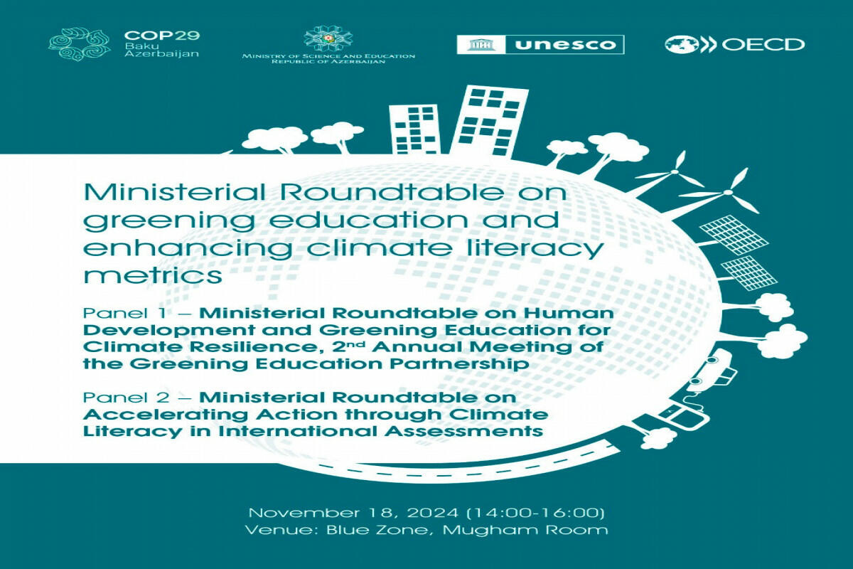 Bildirilib ki, noyabrın 18-də COP29 Sədrliyi, Elm və Təhsil Nazirliyi, UNESCO, İqtisadi Əməkdaşlıq və İnkişaf Təşkilatının (İƏİT) tərəfdaşlığı ilə müxtəlif ölkələrin təhsil nazirlərinin iştirakı ilə "Təhsilin yaşıllaşdırılması və iqlim dayanıqlılığı", "Beynəlxalq qiymətləndirmə çərçivəsində ətraf mühit savadlılığının ölçülməsi" mövzularında panellər təşkil ediləcək. COP29 çərçivəsində həmçinin BMT-nin 2022-ci ildə başlatdığı və 90-dan çox ölkənin qoşulduğu "Greening Education Partnership" təşəbbüsünün ikinci dəfə illik iclasının keçirilməsi nəzərdə tutulur.