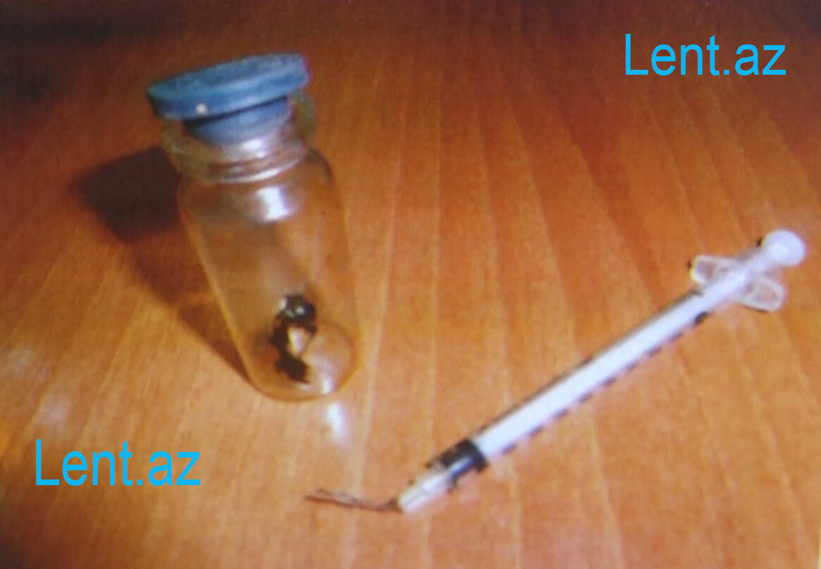 Hadisə yerinə baxış keçirilərkən meyitin əynindəki şalvarın sağ cibindən şprits və içərisində, narkotik vasitə olan şüşə dərman qabı tapılıb.