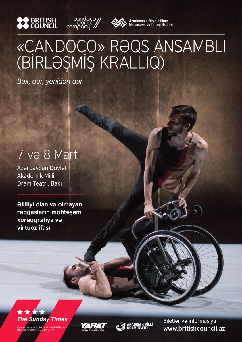 Əlilliyi olan və olmayan rəqqaslardan ibarət "Candoco" rəqs ansamblının iki hissəli valehedici tamaşasını izləmək istəyənlər 7-8 mart tarixlərində, saat 19:00-da Azərbaycan Akademik Milli Dram Teatrına dəvət olunurlar. Layihə Azərbaycan Respublikasının Mədəniyyət və Turizm Nazirliyi, Yarat Müasir İncəsənət Mərkəzi və Azərbaycan Dövlət Akademik Dram Teatrının dəstəyi ilə təşkil edilir.