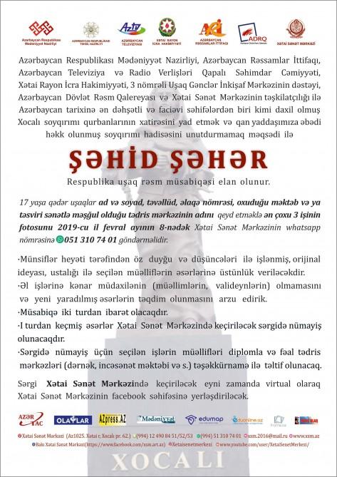 22 Yanvar 2019 13:57 MədəniyyətBakıda Xocalı soyqırımının 27-ci ildönümünə həsr olunmuş "Şəhid şəhər" adlı uşaq rəsm müsabiqəsi elan olunub.