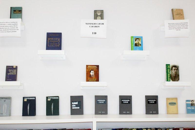 Sərgidə alimin Azərbaycan və rus dillərində yazılmış "Klassiklərimiz haqqında", "Seçilmiş əsərlər", "Həyatın romantikası", "Cəlil Məmmədquluzadə", "Əntiqə adamlar", "XIX əsr rus ədəbiyyatı", "Sənət yollarında", "M.F.Axundovun ədəbi-tənqidi görüşləri", "Səni kim unudar", "Azərbaycan-rus ədəbi əlaqələri tarixindən", "Mütəfəkkirin şəxsiyyəti", "Hüseyn Cavid", "Rus klassikləri", "Taras Şevçenko", "Get dolangilən, xainsən hələ" əsərləri və "Məmməd Cəfər. Biblioqrafiya" nümayiş olunur.