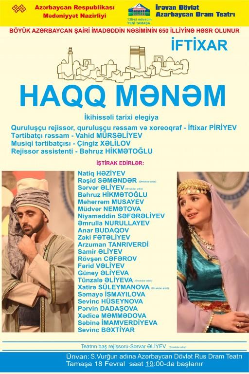 Fevralın 18-də Cəfər Cabbarlı adına İrəvan Dövlət Azərbaycan Dram Teatrı S.Vurğun adına Azərbaycan Dövlət Akademik Rus Dram Teatrının səhnəsində dahi Azərbaycan şairi İmadəddin Nəsiminin 650 illiyinə həsr olunmuş, şair-dramaturq İftixarın “Haqq mənəm” pyesi əsasında hazırlanan tamaşanı - ikihissəli tarixi elegiyanı təqdim edəcək.