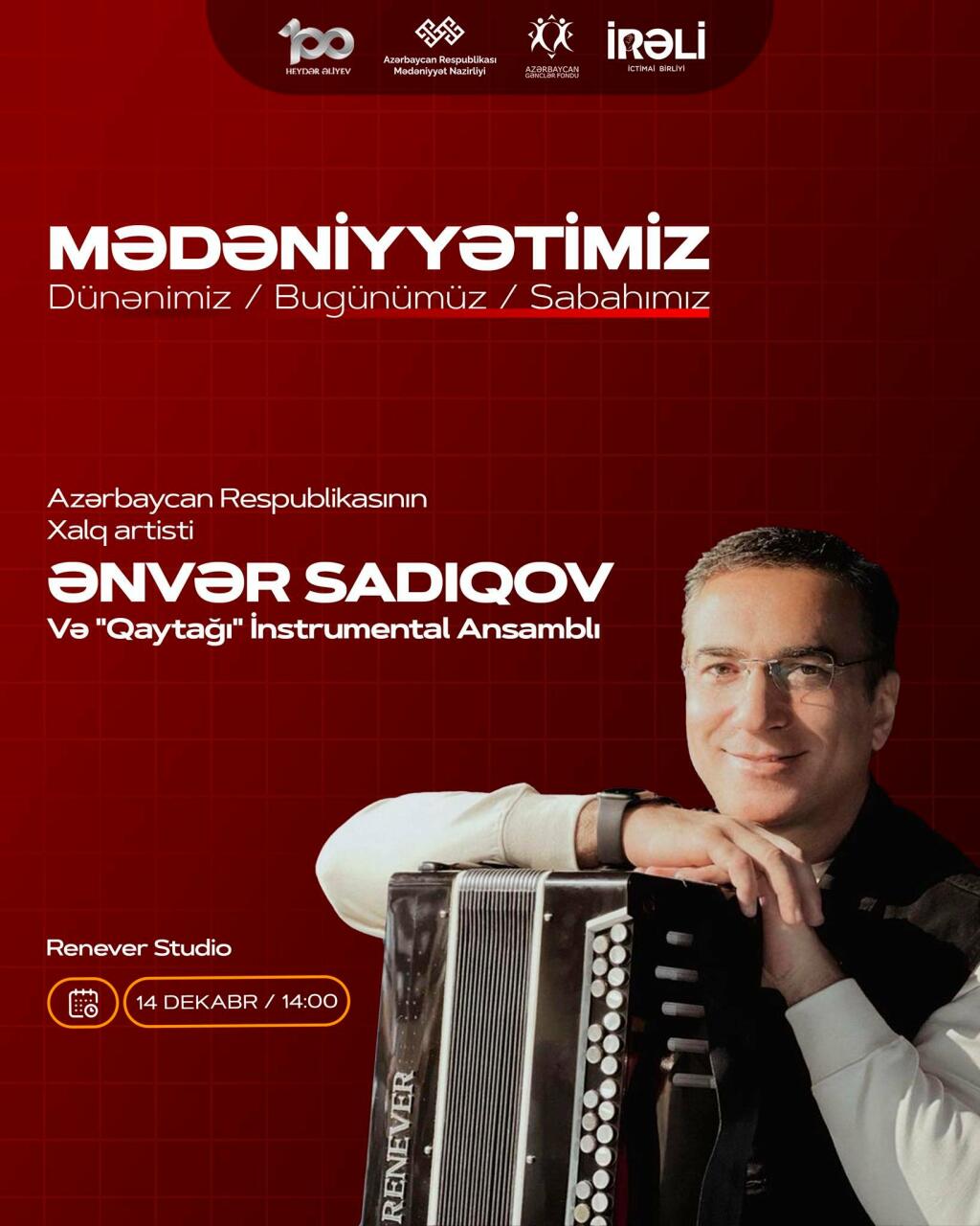 13 Dekabr 2023 18:39 Mədəniyyət"İRƏLİ" İctimai Birliyinin təşkilatçılığı, Azərbaycan Respublikası Mədəniyyət Nazirliyinin dəstəyi ilə həyata keçirilən "MədəniyyətimİZ" layihəsinin növbəti qonağı Xalq artisti Ənvər Sadıqov və onun rəhbərlik etdiyi "Qaytağı" İnstrumental Ansamblı baş tutacaq.