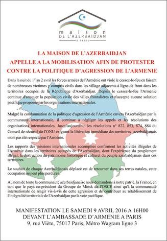 Eyni zamanda, Parisdə fəaliyyət göstərən "Azərbaycan Evi" Fransa ictimaiyyətinə çağırış ünvanlayıb. Bu çağırışda "Azərbaycan evi" Fransa ictimaiyyətini Ermənistanın təcavüzkar siyasətinə qarşı öz etirazını bildirmək üçün səfərbər olmağa, aprelin 9-da Ermənistan səfirliyi qarşısında keçiriləcək nümayişdə iştirak etməyə çağırıb. Nümayiş 9 Aprel 2016-cı il tarixdə, saat 16.00-da Paris şəhəri, Vyet küçəsi, 9 ünvanında yerləşən Ermənistan Səfirlliyi qarşısında keçiriləcək. "Azərbaycan Evi"nin Müraciətində deyilir: "Aprelin 1-dən 2-ə keçən gecə Ermənistan hərbi qüvvələri atəşkəsi pozmaqla Azərbaycan Respublikasının işğal olunmuş əraziləri ilə həmsərhəd bölgələrdə çoxsaylı itkilərə, o cümlədən mülki əhali arasında ağır itkilərə səbəb olmuşdur. Atəşkəsin elan olunduğu vaxtdan Ermənistan cəbhəboyu kəndlərdə yaşayan mülki əhaliyə mütəmadi olaraq hücumlarını davam etdirir və beynəlxalq təşkilatlar tərəfindən təklif olunan sülh təkliflərini qəbul etmir.