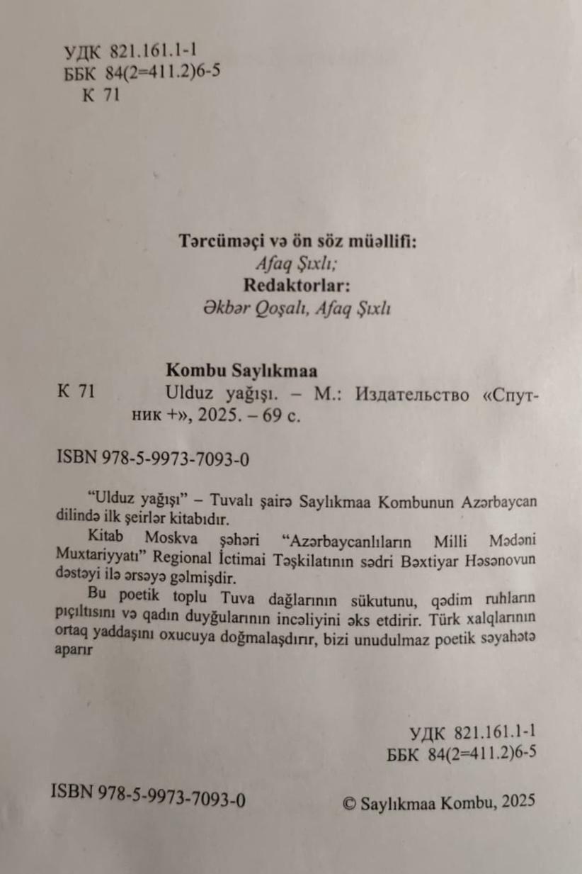 Книга "Звездный дождь", которую мы представляем нашим читателям, - это первый сборник стихов известной и талантливой тувинской поэтессы Сайылыкмаа Комбу, переведенный на наш родной язык. Эта книга также является для меня выражением первой встречи с глубоко близкой поэзией, первого изумления, первой гордости.