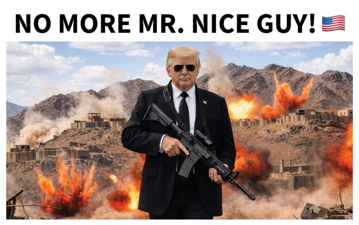 Пост сопровождался изображением, на котором Трамп изображен на фоне боевых действий с автоматом. Фото сопровождается подписью "No more Mr. Nice Guy!" (больше не будет хорошего парня).