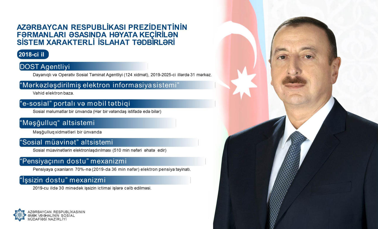 Azərbaycan Respublikasının Prezidenti cənab İlham Əliyevin tapşırıqları əsasında Əmək və Əhalinin Sosial Müdafiəsi Nazirliyi tərəfindən 2018-ci ildə sosial müdafiə və aktiv məşğulluq tədbirlərinin gücləndirilməsi ilə yanaşı, sosial sahədə xidmətlərin vahid mərkəzdən şəffaf, operativ və əlçatan şəkildə təşkilinə yönələn mühüm islahatlar ili olub.