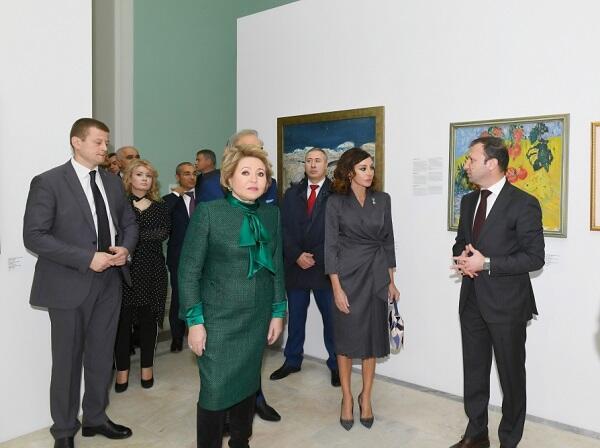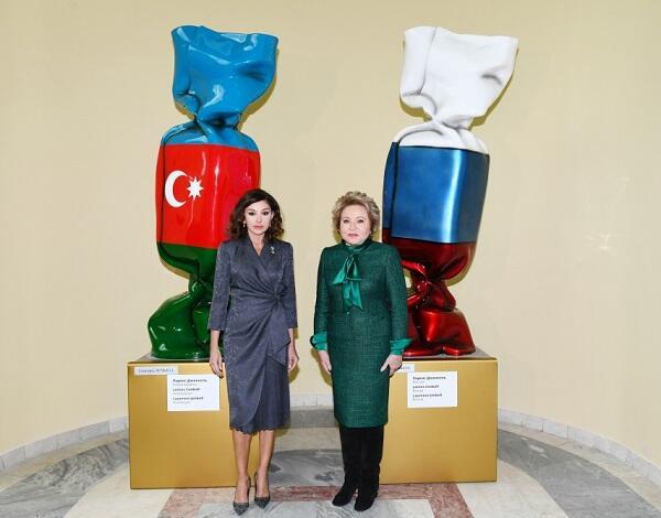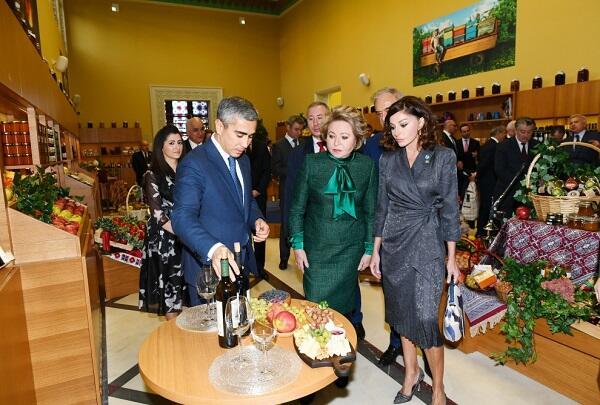 Azərbaycanın Birinci vitse-prezidenti Mehriban Əliyevanı, Heydər Əliyev Fondunun vitse-prezidenti Leyla Əliyevanı və Rusiya Federasiyası Federal Məclisinin Federasiya Şurasının sədri Valentina Matviyenkonu Xalq Təsərrüfatı Nailiyyətləri Sərgisinin direktoru Sergey Şaqurov qarşıladı.