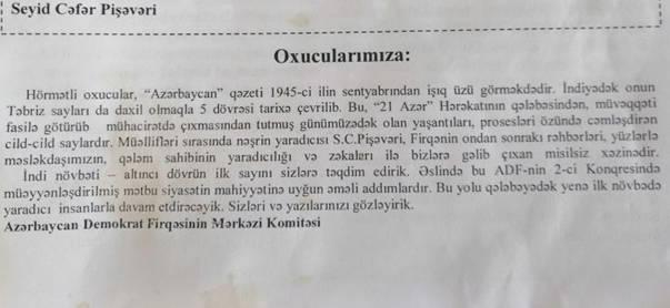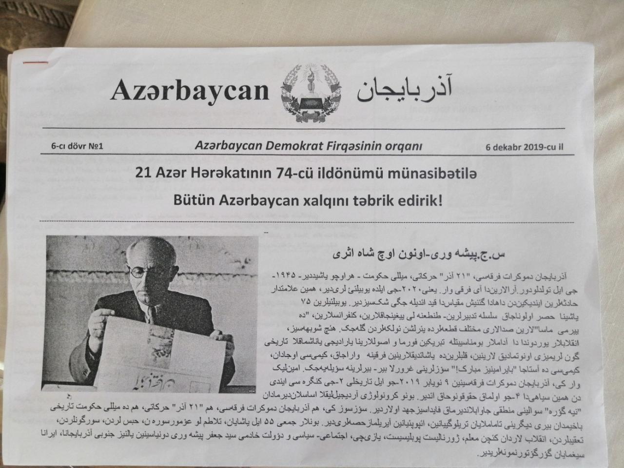 Noyabrın 6-da "İrşad" İslam Araşdırmalar Mərkəzinin konfrans zalında "21 Azər" Hərakatının 74-cü ildönümü qeyd olunub. Azərbaycan Demokrat Firqəsi Mərkəzi Komitəsinin keçirdiyi tədbirdə partiya funksionerləri, üzvləri, şanlı inqilabın iştirakçıları, şahidləri, alim və tədqiqatçılar, media təmsilçiləri iştirak ediblər. Elmi-nəzəri konfransın açılışında və bağlanışında Azərbaycan Respublikasının və Azərbaycan Milli Hökumətinin himnləri səslənib. Sonra Ulu Öndərimiz Heydər Əliyevin, ADF-nin, firqənin və inqilabın rəhbəri Seyid Cəfər Pişəvərinin, onun varislərinin, silahdaşlarının xatirələri bir dəqiqəlik sükutla yad edilib.