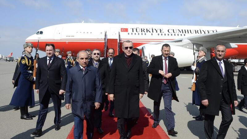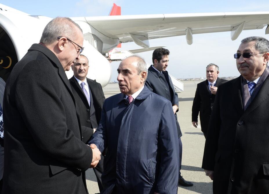 Türkiyə Respublikasının Prezidenti Rəcəb Tayyib Ərdoğanı Heydər Əliyev Beynəlxalq Aeroportunda Azərbaycan Respublikası Baş Nazirinin birinci müavini Yaqub Eyyubov, Xarici İşlər nazirinin müavini Xələf Xələfov və digər rəsmi şəxslər qarşıladılar.