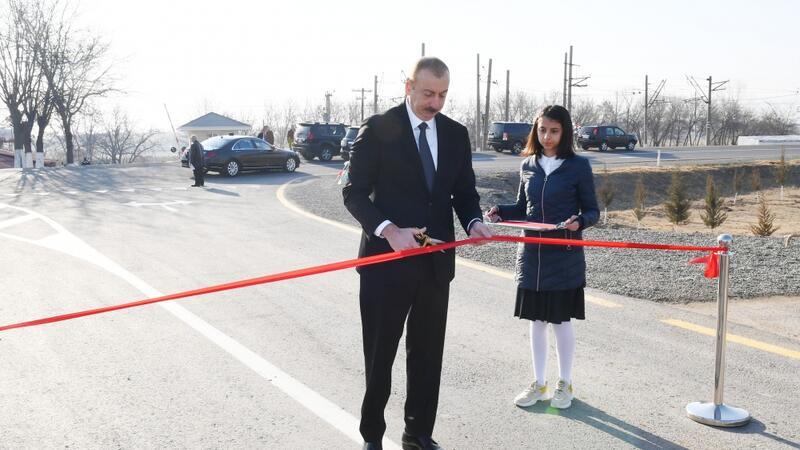 Prezident İlham Əliyev yolun rəmzi açılışını bildirən lenti kəsdi.