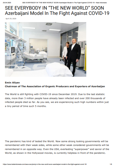 29 Aprel 2020 13:41 Siyasətİctimai fəal, "Ekoloji təmiz məhsul istehsalçıları və ixracatçıları" İctimai Birliyinin sədri Emin Əliyevin ""Yeni dünya"da görüşənədək. COVİD-19 ilə mübarizənin Azərbaycan modeli" adlı məqaləsi İndoneziyanın aparıcı internet portallarında çap edilib.