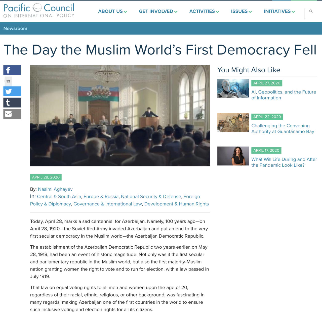 29 Aprel 2020 14:05 SiyasətLos Anceles şəhərindəki Azərbaycanın baş konsulu Nəsimi Ağayevin Azərbaycanın bolşeviklər tərəfindən işğalının və Azərbaycan Demokratik Respublikasının (ADR) süqutunun 100 illiyi ilə bağlı yazdığı məqalə ABŞ-ın xarici siyasət sahəsində ən nüfuzlu təşkilatlarından olan Beynəlxalq Siyasət üzrə Sakit Okean Şurası (Pacific Council on International Policy) tərəfindən dərc edilib.