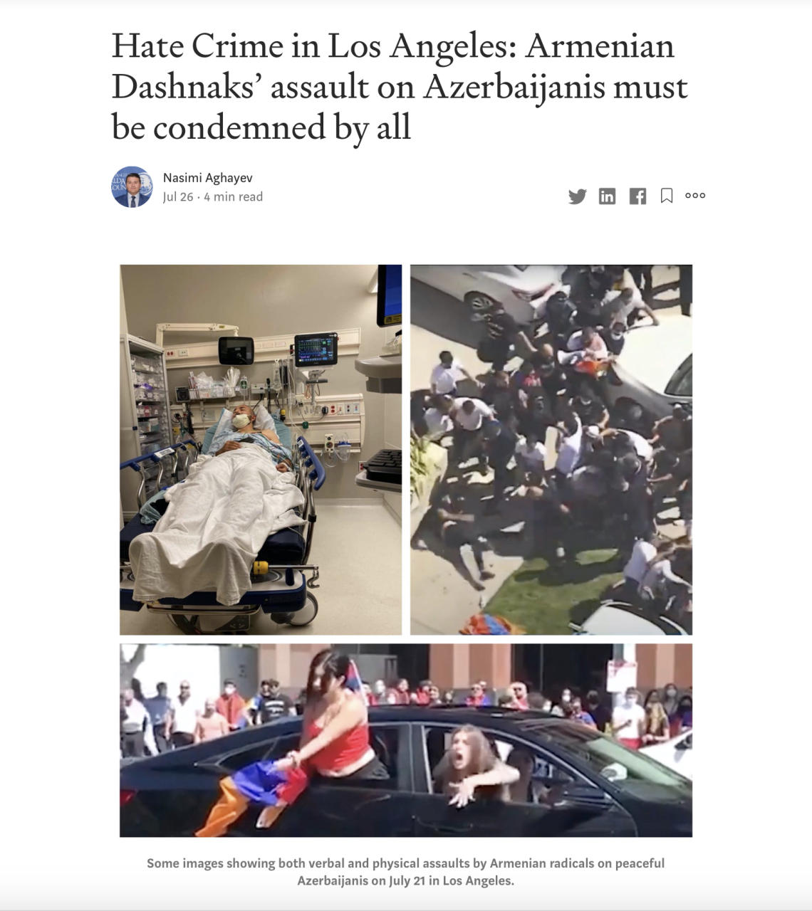 Olaylar.az bildirir ki, məqalədə baş konsul hadisə haqda ətraflı məlumat verərək, Los Ancelesdəki Baş Konsulluğumuz qarşısında aksiya keçirən erməni daşnaklarının, Ermənistanın Azərbaycana qarşı təcavüzü və etnik təmizləmə siyasətinə, eləcə də ölkəmizə qarşı həyata keçirdiyi son hərbi təxribatına etiraz edən 50-yə yaxın həmyerlimizə hücum edərək, onlardan bir neçəsinə xəsarət yetirdiklərini bildirir və hazırda hadisənin polis tərəfindən nifrət zəmnində törədilən cinayət maddəsi üzrə araşdırıldığını diqqətə çatdırır.