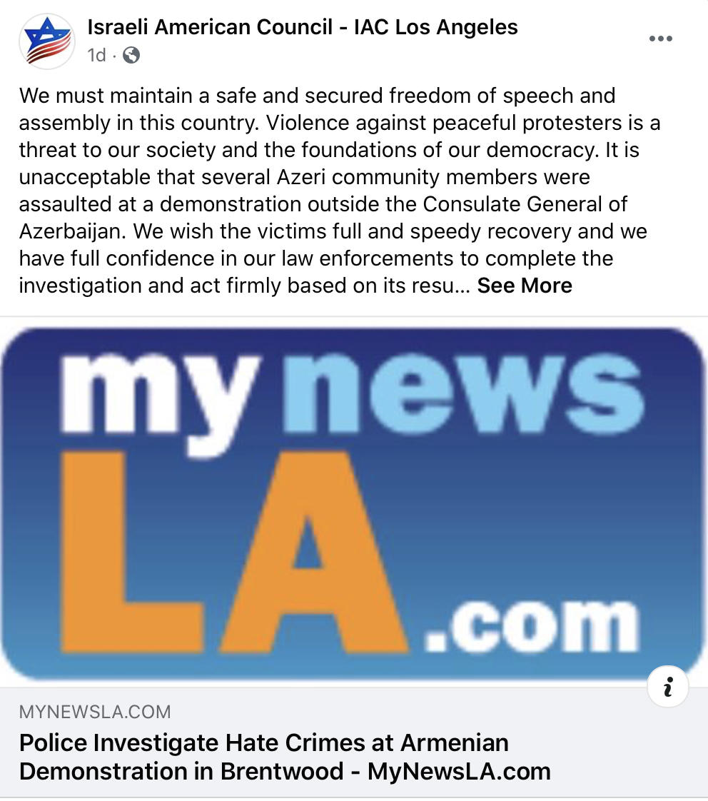 28 İyul 2020 12:25 SiyasətAmerikalı israillilərin ən böyük təşkilatı olan nüfuzlu İsrail-Amerika Şurası (IAC) 21 iyul tarixində Baş Konsulluq qarşısında erməni daşnaklarının Azərbaycan icmasının üzvlərinə qarşı həyata keçirdiyi vəhşilikləri pisləyib.