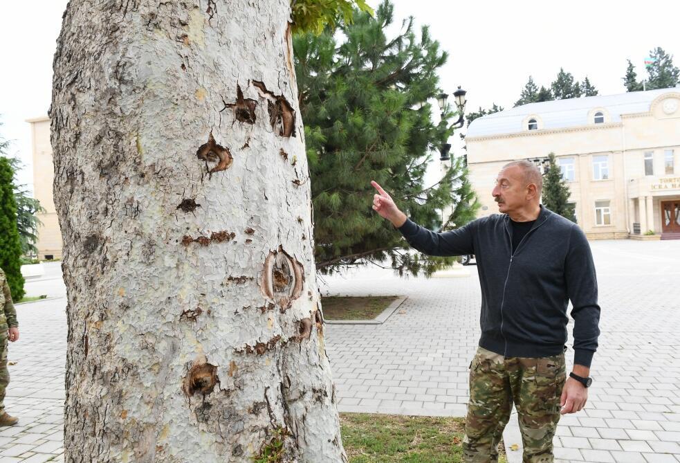 Sonra Prezident İlham Əliyev Tərtər şəhərinin mərkəzində Ermənistan silahlı birləşmələri tərəfindən rayona müxtəlif tipli reaktiv yaylım atəşi sistemləri və artilleriya qurğularından atılmış mərmilərə baxıb.