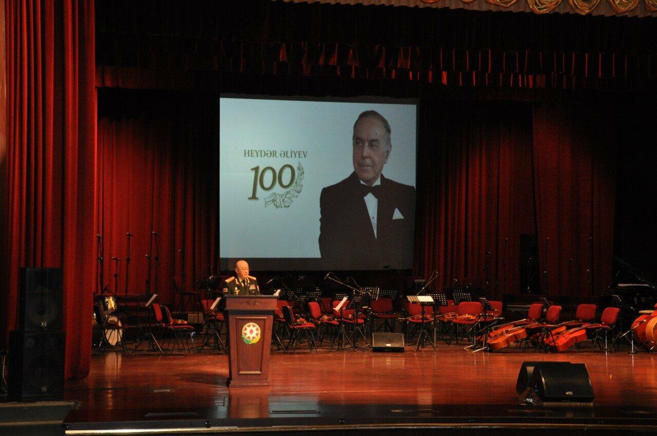 Sonra tədbirdə çıxış edən fövqəladə hallar naziri general-polkovnik Kəmaləddin Heydərov xalqımızın böyük oğlu Ümummilli Lider Heydər Əliyevin mənalı həyat yolundan, Vətən qarşısında tarixi xidmətlərindən danışıb. 100 illik yubileyinin ölkəmizin hər yerində və onun hüdudlarından kənarda yüksək ehtiram və dərin minnətdarlıq hissi ilə geniş qeyd olunduğunu bildirən nazir, varlığında bütöv bir millətin ruhunu yaşadan, şəxsiyyətində xalqın ən gözəl keyfiyyətlərini cəmləşdirən Dahi Rəhbərin həyatını öz xalqına həsr etdiyini xatırladıb. "Ulu Öndərin çoxşaxəli fəaliyyəti də, şəxsiyyəti də Azərbaycan tarixinin ayrılmaz, şərəfli bir hissəsini təşkil edir. Onun qurub yaratdıqları, müdrik ideyaları, müqəddəs irsi təkcə dünənimiz və bu günümüz üçün deyil, eyni zamanda gələcəyimiz üçün də əvəzsizdir".