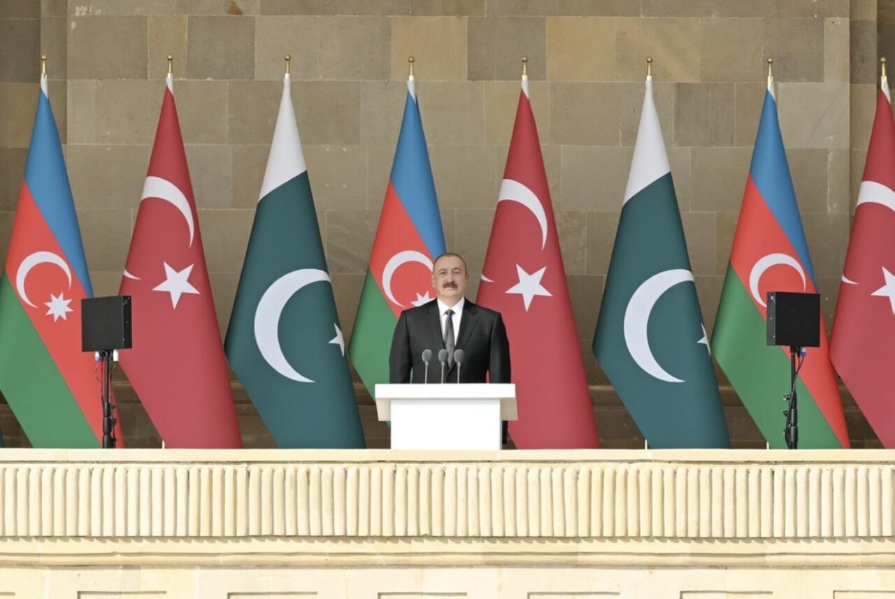 Olaylar.az AZƏRTAC-a istinadən xəbər verir ki, Azərbaycan Respublikasının Prezidenti İlham Əliyev, birinci xanım Mehriban Əliyeva, Türkiyə Respublikasının Prezidenti Rəcəb Tayyib Ərdoğan, Pakistan İslam Respublikasının Baş naziri Məhəmməd Şahbaz Şərif paradda iştirak edirlər.