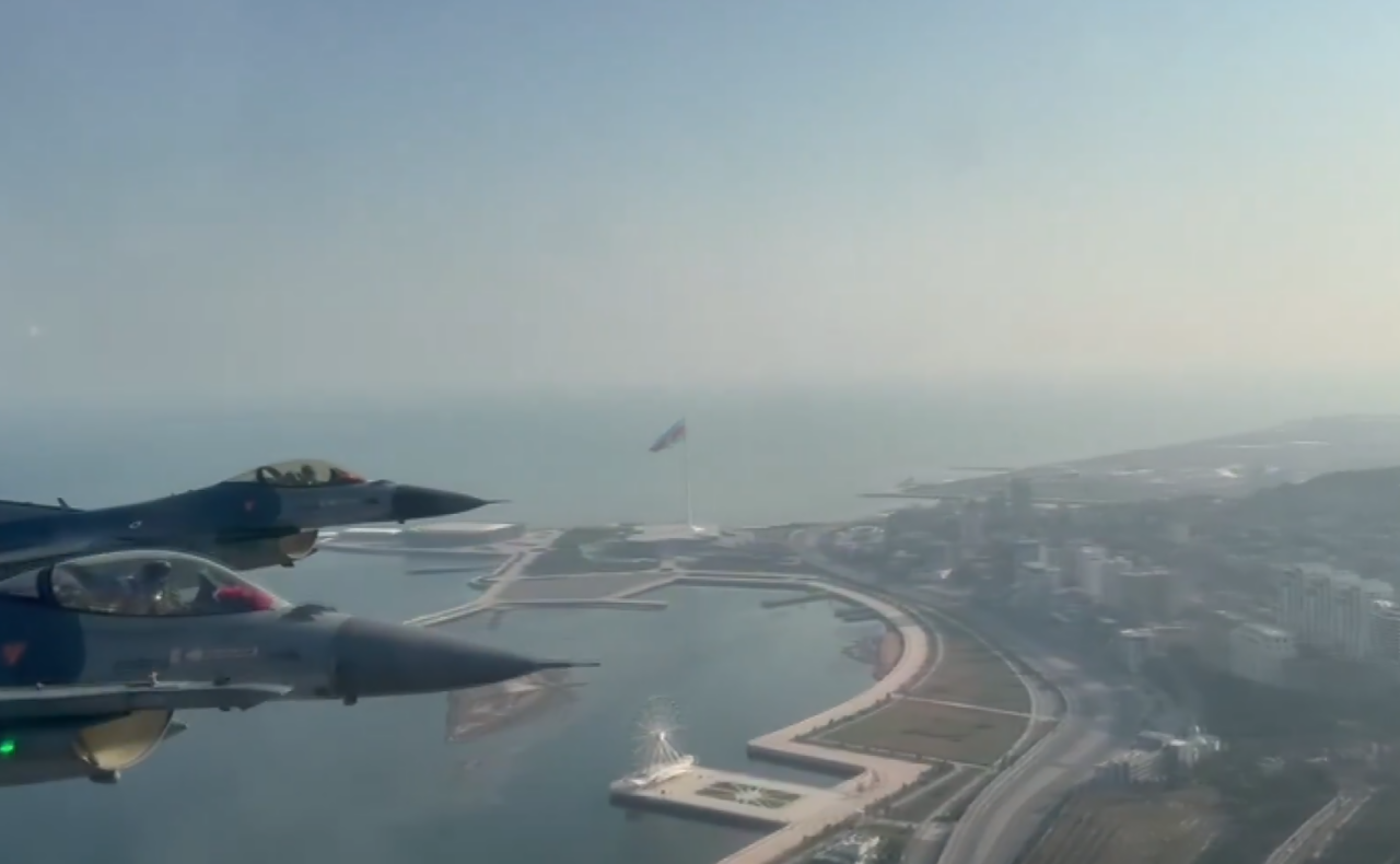 "Azərbaycanın Zəfər Günündə Bakıda keçirilən hərbi parad zamanı salamlama uçuşu edən Hərbi Hava Qüvvələrimizin təyyarəsinin göyərtəsindən o anlar..."