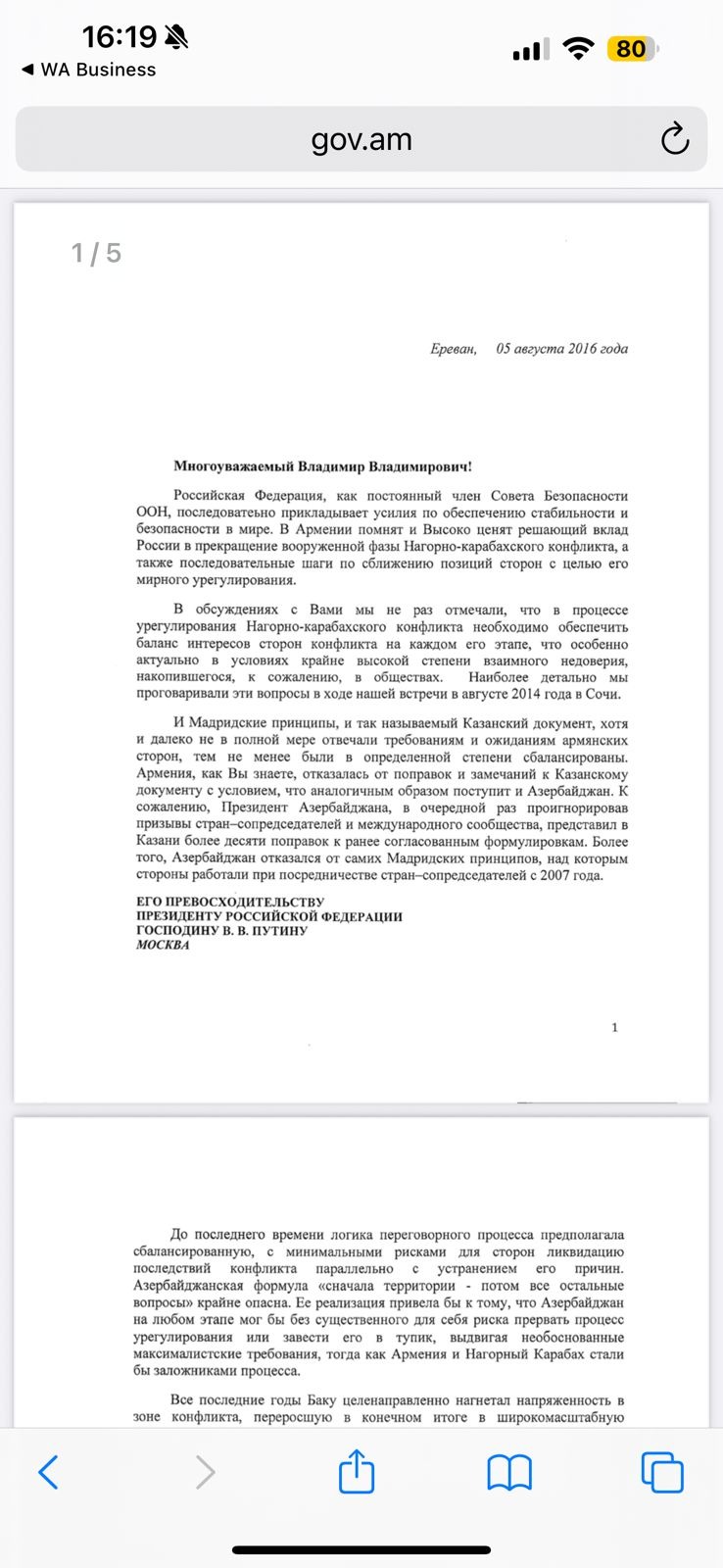 Olaylar.az Serj Sarkisyanın 05 avqust 2016-cı ildə Vladimir Putinə ünvanladığı məktubun tam, peşəkar və birə-bir tərcüməsini təqdim edir: