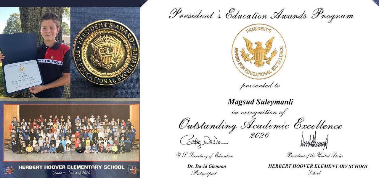 "OLAYLAR"-a Diasporla İş üzrə Dövlət Komitəsindən verilən xəbərə görə, Nyu-Yorkdakı Herbert Huver adına ibtidai məktəbin 4-cü sinfini başa vuran azyaşlı soydaşımız Maqsud Süleymanova ABŞ Prezidentinin Təhsil Mükafatı Proqramının sertifikatı təqdim olunub. O, bu mükafata 2020-ci tədris ilini müvəffəqiyyətlə başa vurduğuna görə layiq görülüb.