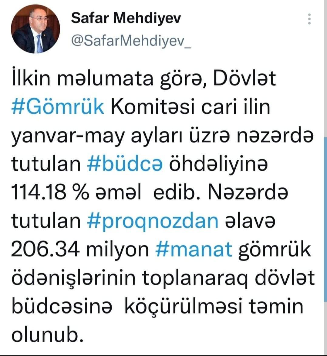 Nəzərdə tutulan proqnozdan əlavə 206,34 milyon manat gömrük ödənişlərinin toplanaraq dövlət büdcəsinə köçürülməsi təmin olunub.