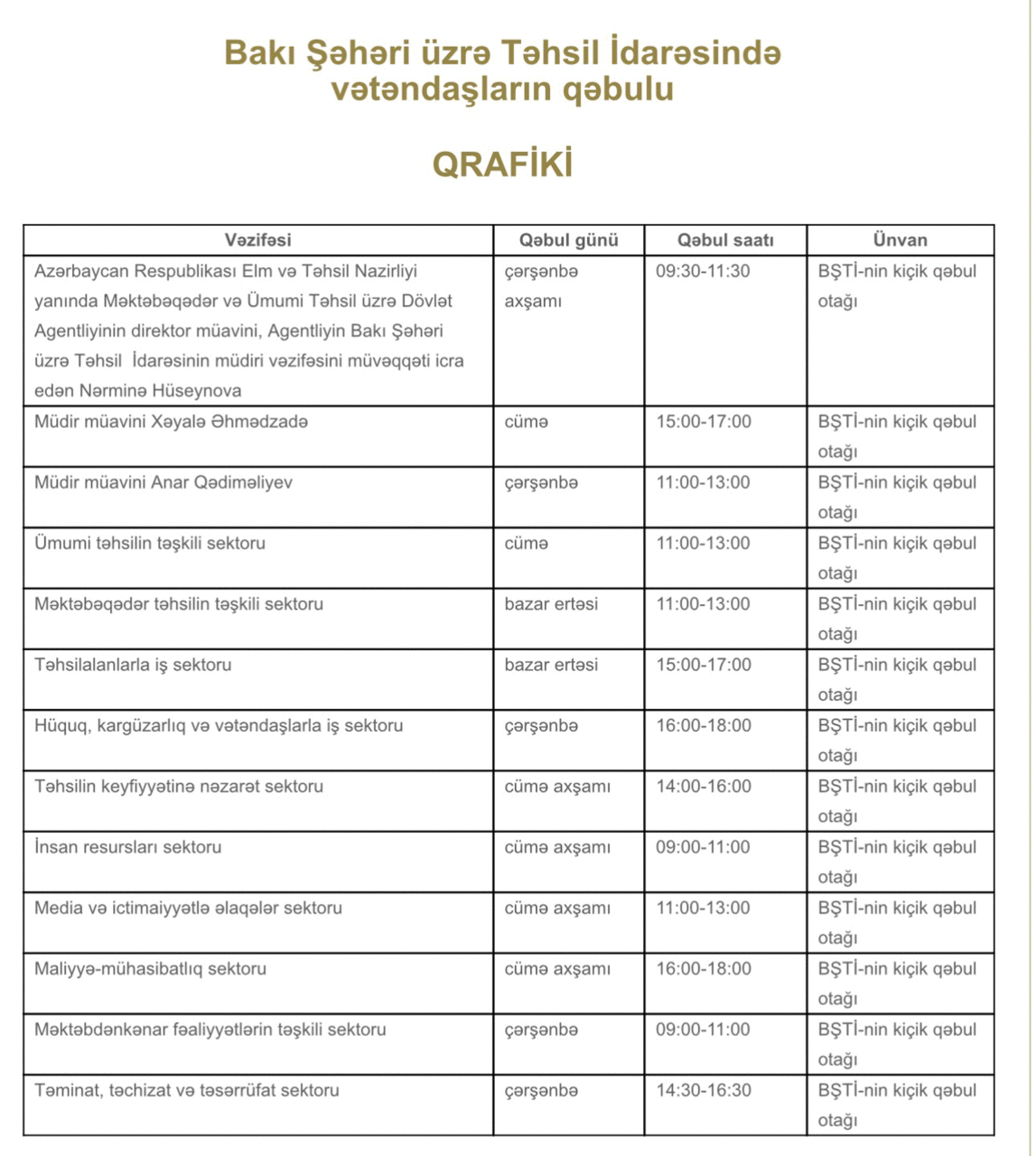 15:20 SosialBakı Şəhəri üzrə Təhsil İdarəsi (BŞTİ) tərəfindən vətəndaş məmnunluğunun təmin edilməsi əsas hədəflərdəndir. Bu baxımdan qanunvericiliyə uyğun olaraq BŞTİ-də vətəndaşların qəbulu müvafiq qrafik üzrə həyata keçirilir.