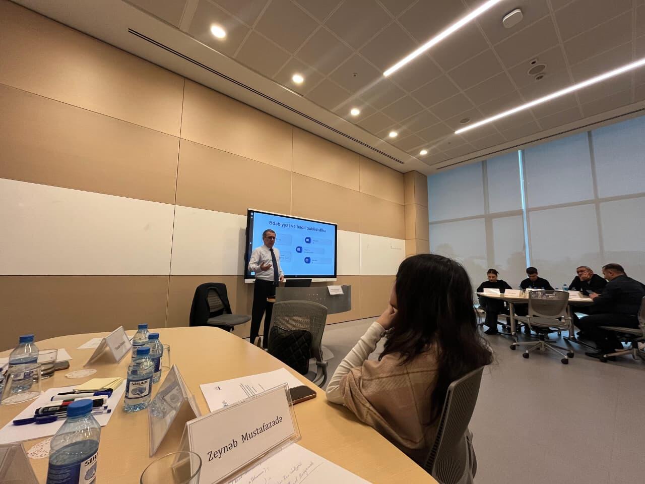 Təlim müddətində iştirakçılar "Publisistik üslubun xüsusiyyətləri: Bədii publisistikanın janrları", "Storytelling: mediada istifadə formaları, ənənəvi və yeni yazı üsulları", "Narrativ nəzəriyyəsi: əsas prinsipləri və istiqamətləri" və "Vörkşop: nəzəri biliklərin möhkəmləndirilməsi" mövzularında sessiyalarda iştirak edib, fəal müzakirələr aparıblar.