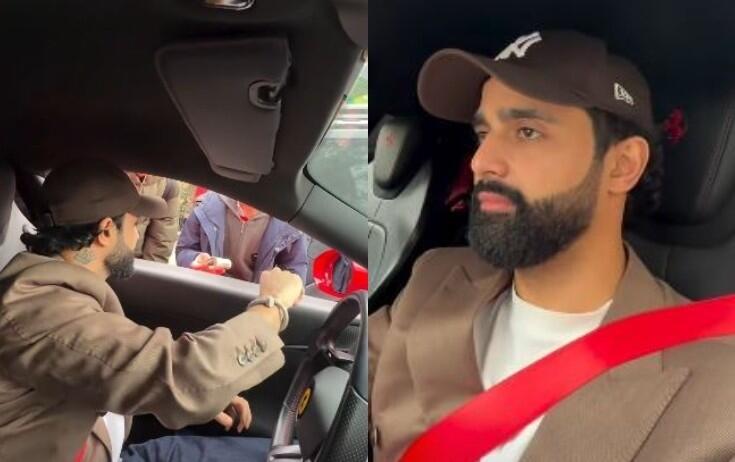 Hüseyn Həsənov Bakıda qırmızı rəngli "Ferrari" avtomobili ilə hərəkətdə olarkən ona bir neçə uşaq yaxınlaşıb. Maşının pəncərəsini açan bloger uşaqlardan birinə bir dəst pul verərək onu sevindirib.