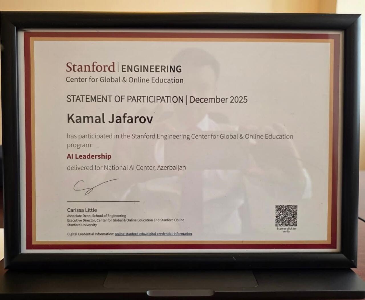 16:04 SosialMilli Məclisin deputatı Kamal Cəfərov rəhbər şəxslər üçün nəzərdə tutulan təlimi başa vurub. Olaylar xəbər verir ki , bu barədə millət vəkili özü məlumat verib:"Rəqəmsal İnkişaf və Nəqliyyat Nazirliyinin dəstəyi ilə dövlət qurumlarının rəhbər şəxsləri üçün Stanford Universiteti tərəfindən keçirilən "AI Leadership" proqramını bitirdim.