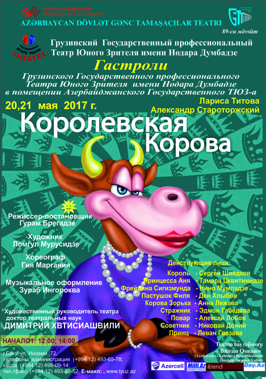Teatrdan "Olaylar" - a bildirlib ki, Gürcüstan Dövlət Peşəkar Gənc Tamaşaçılar Teatrı may ayının 19-22 tarixlərində Bakıda - ADGTT-nın qonağı olaraq L.Titova və A.Starotorjskinin "Королевская корова" ("Kralın inəyi") tamaşası ilə məktəbli dostlarımızı və şəhərimizin qonaqlarını sevindirəcəklər.