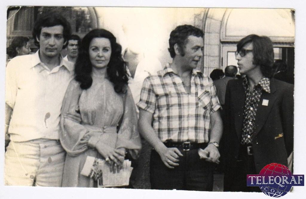 - Türk aktrisa Fatma Girik, Eldar Quliyev, Fatma Giriyin oynadığı "Qızğın torpaq" filminin rejissoru Feyzi Tuna və mən. 26 yaşım var idi. Daşkənddə keçirilən kinofestivalda çəkilib. O festivalda bir neçə dəfə iştirak etmişəm. Sovet İttifaqında Türkiyəyə qarşı münasibət yaxşı deyildi. Bizi Türkiyəyə buraxmırdılar. Onlar sadəcə festivala gəlmişdilər. Ordan Bakıya gəldilər, bir-iki gün qalıb, Türkiyəyə getdilər. Sonralar Feyzi Tuna ilə bir dəfə Türkiyədə görüşdüm.